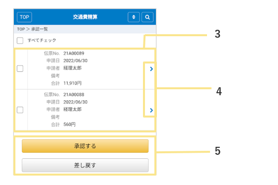 承認一覧画面で、承認する伝票にチェックを入れ、「承認する」をタップで承認できます。