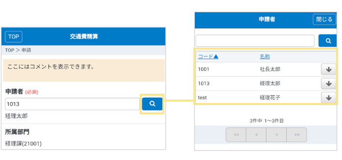 - 申請画面の「申請者」の「虫眼鏡マーク」をクリック