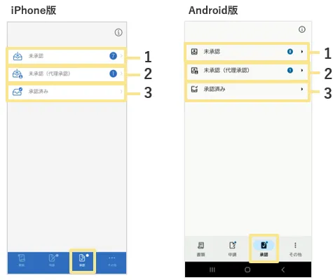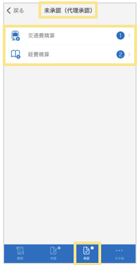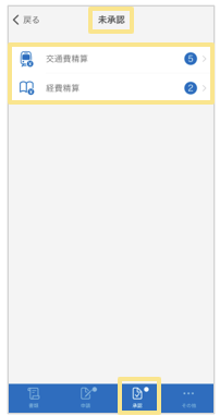 - 「承認」タブ >「未承認」をタップし、承認する伝票種別をタップ