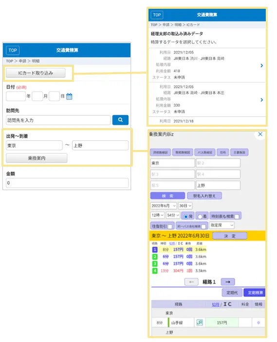 | 交通費精算 | ・申請/代理申請 ・取下げ ・乗換案内機能 ・ファイル添付(オプション) ・ICカード取込み(オプション) ※取込済みのデータの利用のみ可能 新規でICカードのデータを取り込む場合、 別途「楽楽精算ICリーダー」アプリが 必要 ※ICカード取込は交通費精算、出張精算、 海外出張精算で利用可能 ・電子帳簿保存法(オプション) |