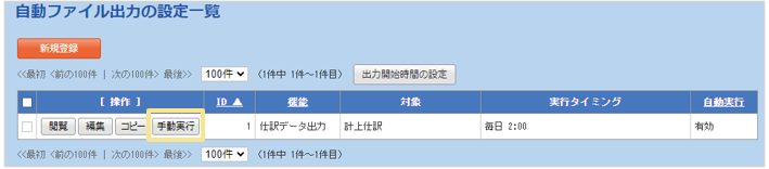 「自動ファイル出力の設定」>「手動実行」を実施した上で、出力されたファイルを