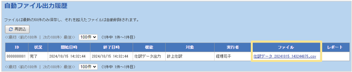 4.自動ファイル出力履歴が表示されたら、「ファイル」列のテキストファイルをクリックして保存