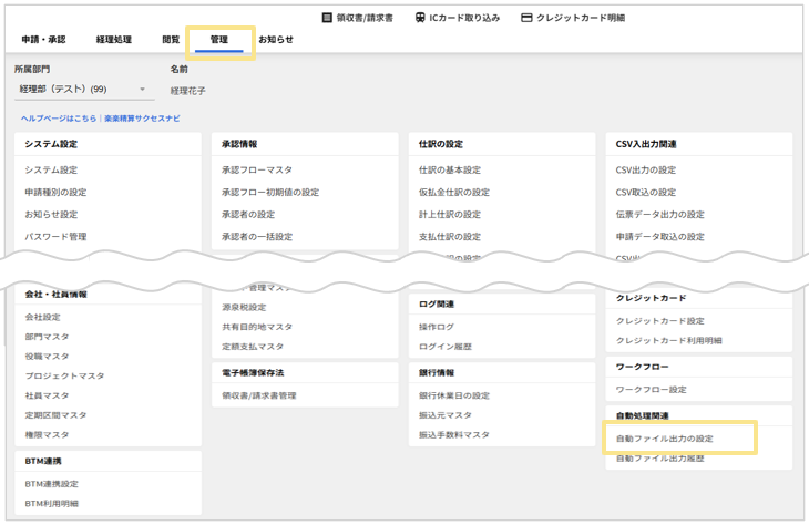 実施したい場合、「楽楽精算」において「自動ファイル出力の設定」>「手動実行」を実施した上で、