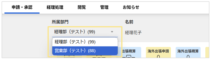 ■対処方法1. 申請者を一時的に複数部門に所属させる
