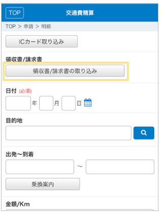 2.「明細」入力画面にて「領収書/請求書の取り込み」をタップ