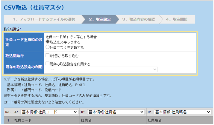 一番上の「社員コード重複時の設定」を「社員マスタを更新する」にしてください。