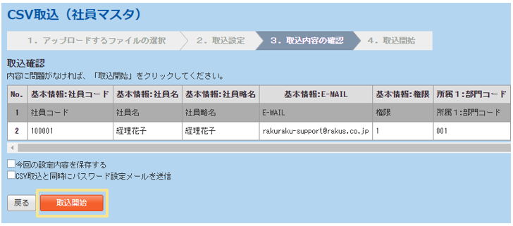 10.取込確認の画面となるので、エラーが表示されていなければ「取込開始」をクリック
