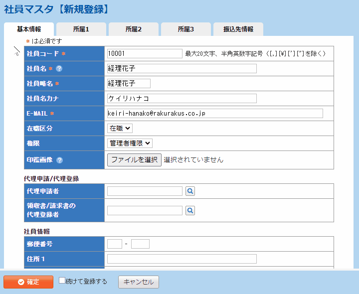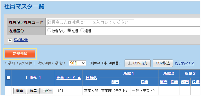事前に登録した「部門マスタ」「役職マスタ」の情報を社員の所属情報として登録します。