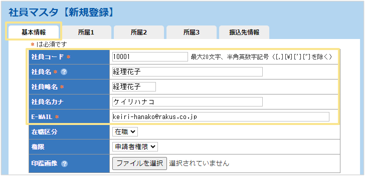 「楽楽精算」を利用するユーザーとして社員の情報を登録します。