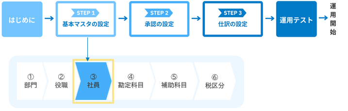 「社員マスタ」の登録が完了したら、次は「④勘定科目の登録」に進みましょう。