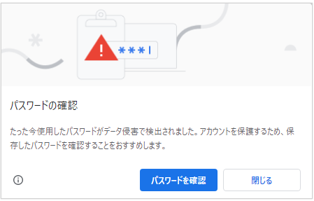 Google Chrome にて入力したパスワードの脆弱性が検知された場合に表示されるメッセージです。