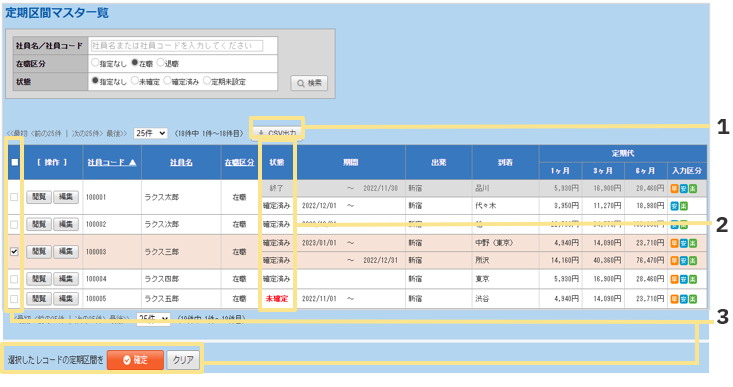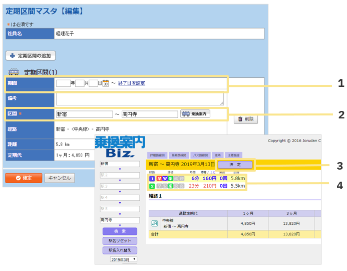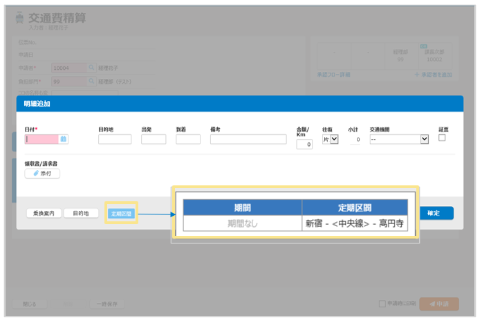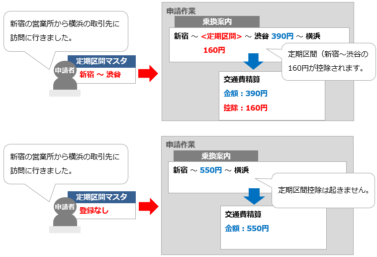 利用して控除が起こります。 - 定期区間の登録は、定期区間マスタに定期区間を直接入力する方法と、申請者が定期区間を設定