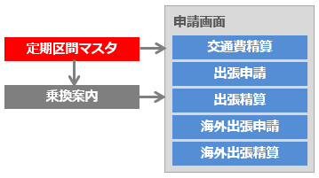 交通費精算/出張申請/出張精算/海外出張申請/海外出張精算 - 「乗換案内」を起動して経路検索を行った場合に、「定期区間マスタ」に登録された情報を