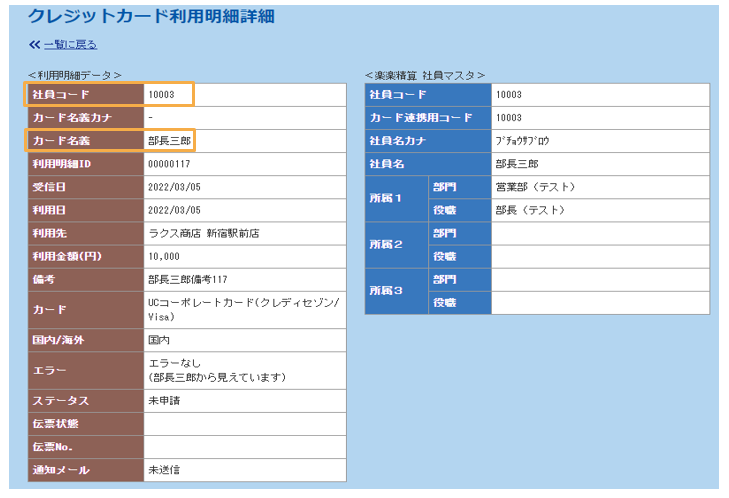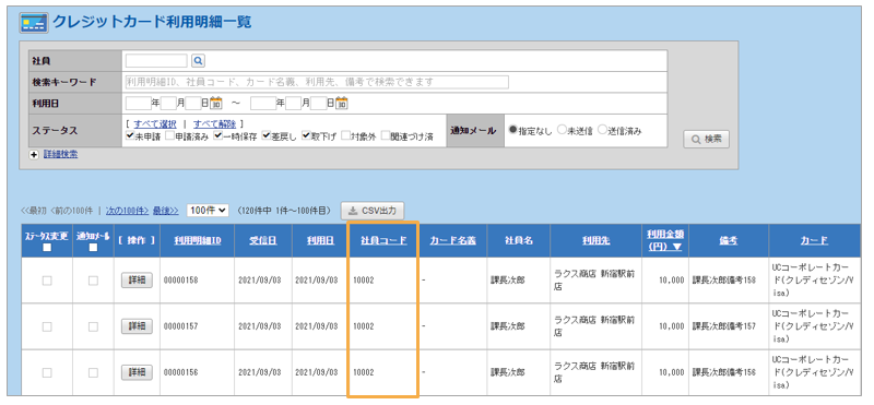 から連携されるカード利用明細情報内の「社員コード」が表示されます。