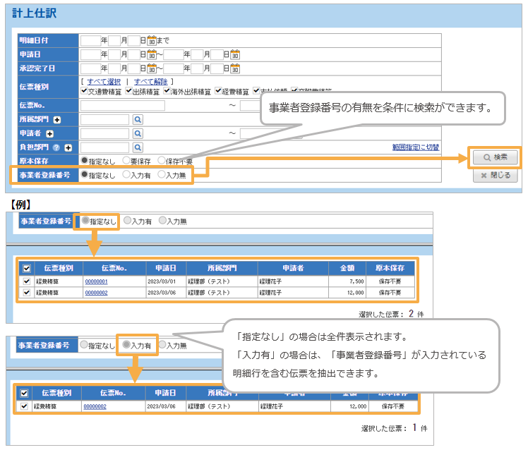 1-3. 計上仕訳/支払確定/振替仕訳にて「事業者登録番号」の有無による検索ができます。