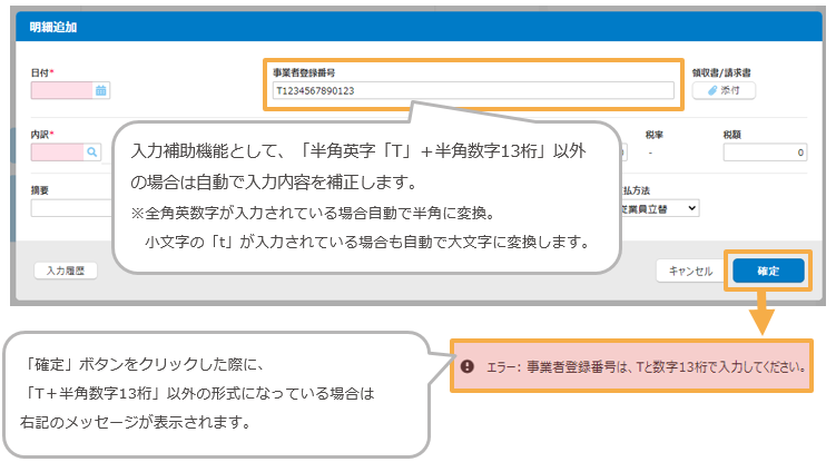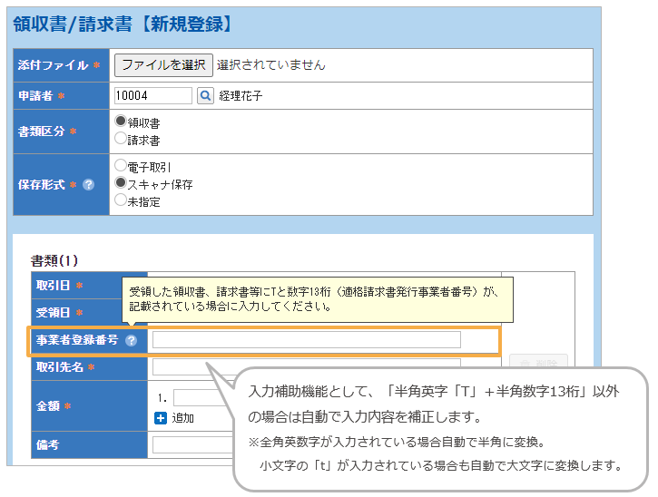 領収書/請求書の新規登録時や編集時に「適格請求書発行事業者番号」を