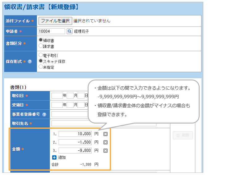 これまで領収書/請求書の登録時にマイナス金額では登録ができませんでした。
