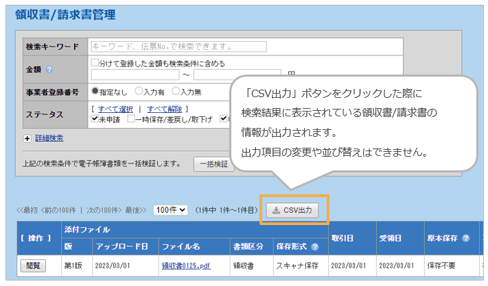 「管理」タブ >「領収書/請求書管理」メニューにて、一覧画面の情報をCSVで