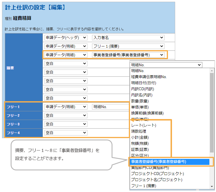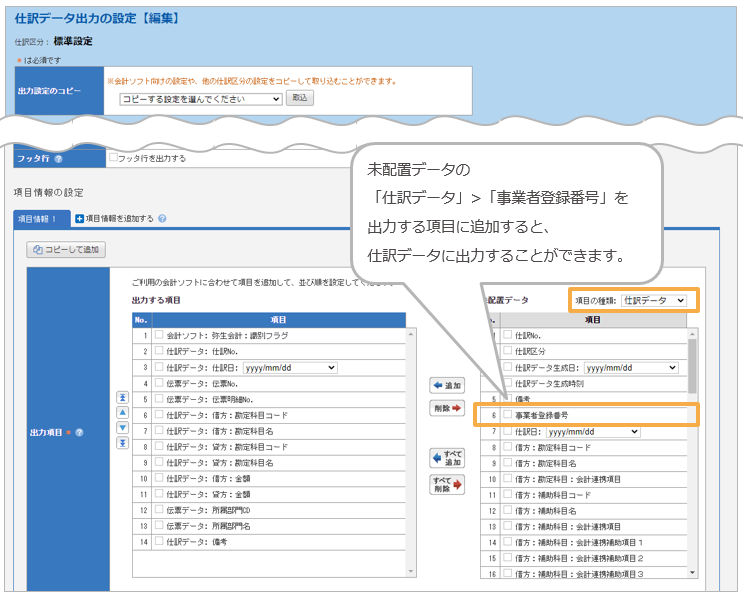 ・「申請データ取込の設定」で取込項目として「事業者登録番号」を設定できます。