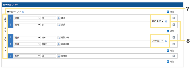 7. にチェックがある場合に表示され、AND承認またはOR承認の選択ができます。