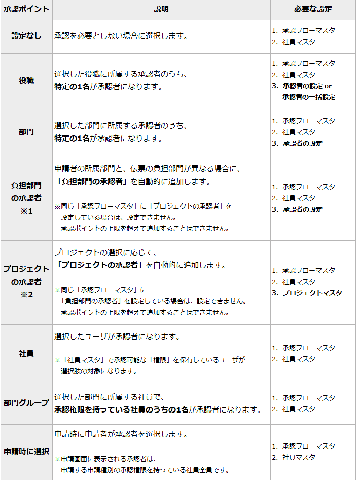 ※申請者は承認ポイントに含みません。使用できる承認ポイントの種類は以下の通りです。