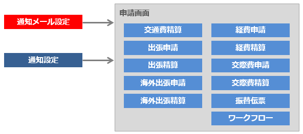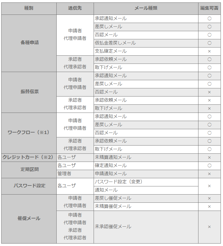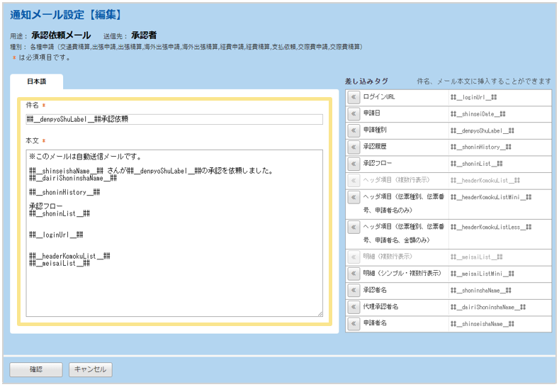 設定できます。 - 各種申請、振替伝票、ワークフローごとにメールの内容を設定できます。