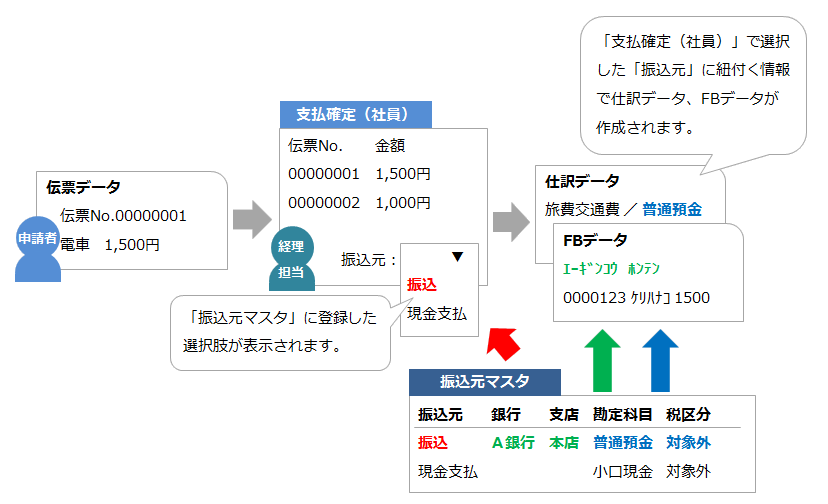 ※計上仕訳を行わない場合は、最終承認まで完了した伝票が対象になります。 - 「振込元」の選択肢は「振込元マスタ」で設定します。