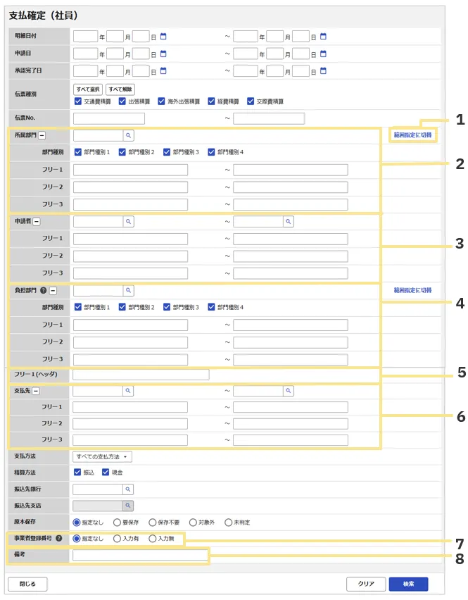 検索できるのは、ヘッダ項目に負担部門が設定されている伝票のみです。