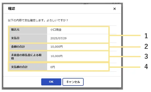 ただし支払方法が「従業員立替」で精算額が1円以上の伝票とまとめて支払確定を行った場合は、