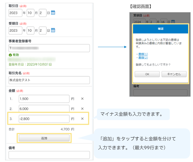 - 複数明細に分けて登録する場合は「追加」をタップし金額を分けて入力します。