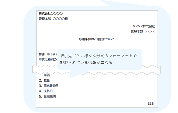 また、取引先から取得したフォーマットのまま経理担当者宛てに共有を行っていたため、