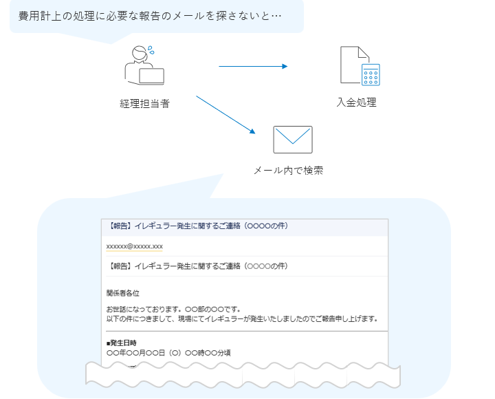 メールを探すのに時間がかかり、費用計上の作業には手間が発生していました。