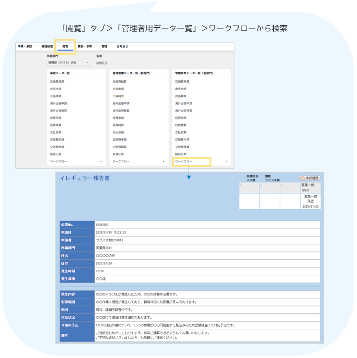 さらに、申請した伝票は「ワークフローオプション」の検索機能ですぐに見つけられるため、