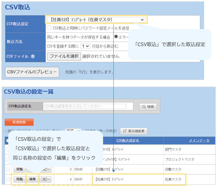 2.「CSV取込」を行った際に選択した「CSV取込設定」の「編集」をクリック