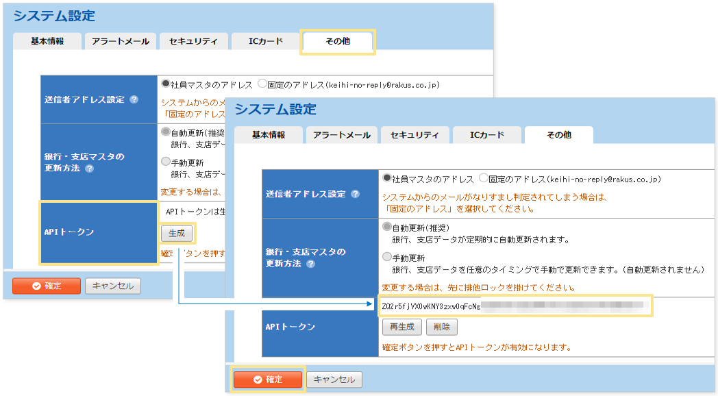 「確定」をクリックすると、再生成後のAPIトークンが「楽楽精算」に登録されます。