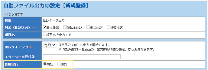「自動ファイル出力の設定」で設定された頻度(毎日、毎週、毎月)および