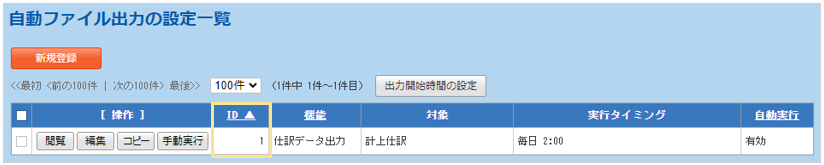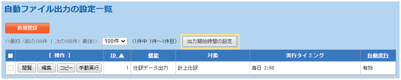 「自動ファイル出力の設定」 > 「手動実行」ボタンから手動でファイル出力の実行ができます。