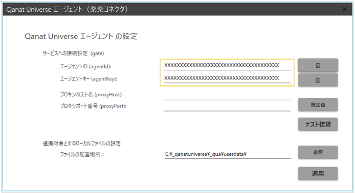 ・AgentKey →「Qanat Universe Agent」に表示される「エージェントキー」を入力