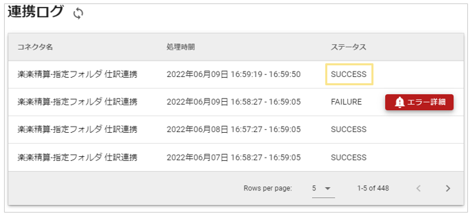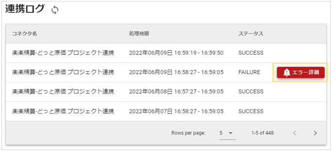 連携エラーがある場合は「コネクタ一覧」の「連携ログ」に「エラー詳細」ボタンが表示されます。
