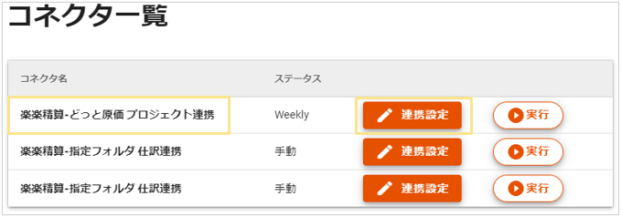 - 「コネクタ一覧」で「楽楽精算‐どっと原価プロジェクト連携」の「実行」ボタンをクリック