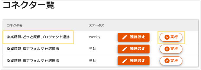 - 「コネクタ一覧」で「楽楽精算‐指定フォルダ 仕訳連携」の「実行」ボタンをクリック