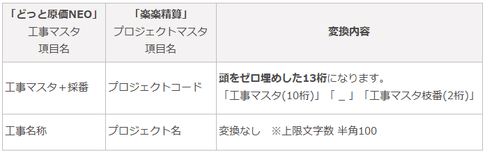 ※「どっと原価NEO」の「工事マスタ」のその他の項目の自動連携はできません。