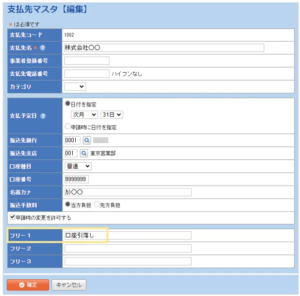 - 「フリー1」~「フリー3」のいずれかに「口座引落し」と入力する