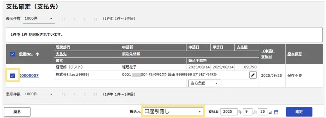 「支払確定」の際に口座引落し用の振込元を選択することで、