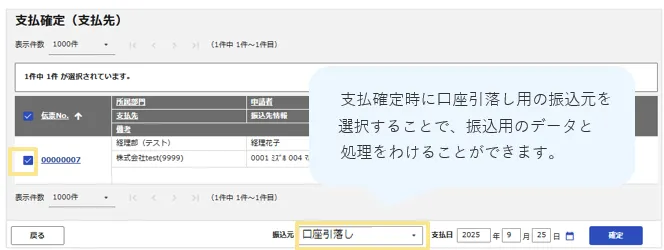 「支払確定」時に 口座引落しの支払先のみを絞り込んで処理ができます。
