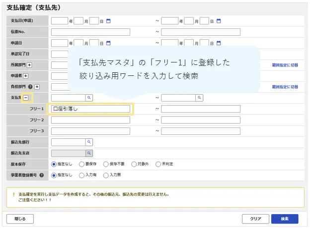 「支払先マスタ」の「フリー」項目を活用し口座引落し用の絞り込み用ワードを設定できます。