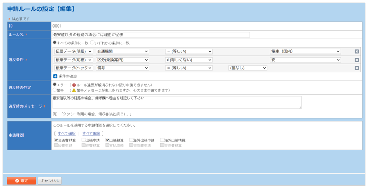 最安値以外の経路の申請を禁止したり、警告のメッセージを出したりすることができるんです!
