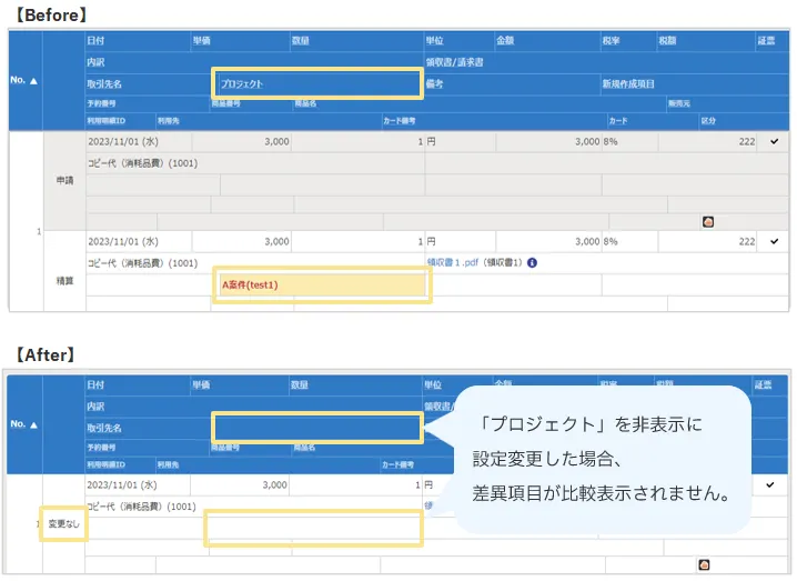 差異項目が「項目設定」で非表示に変更されている場合、「変更なし」と表示されます。