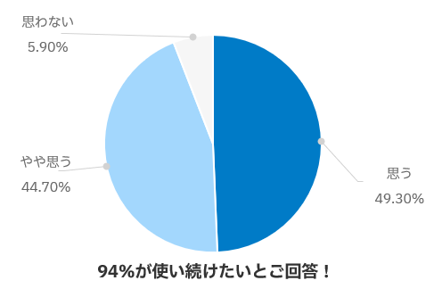 全体の 94% のお客様が継続利用に前向き(「思う、やや思う」の比率の合計)という結果に