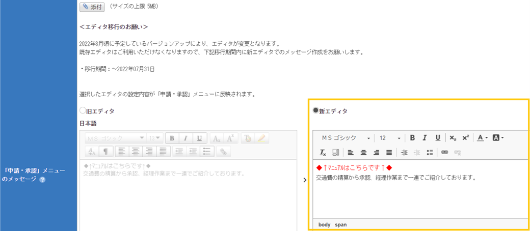 «完了»「「申請・承認」メニューのメッセージ」や「お知らせ設定」のエディタ移行対応について